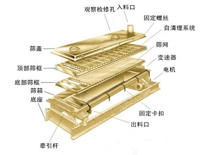方形搖擺篩方形搖擺篩主要由進(jìn)料口、上蓋、觀察孔、篩框、密封圈、出料口、網(wǎng)架、束環(huán)、主樞軸總成、調(diào)整塊、彈簧、主軸總成、皮帶輪、底座、檢查孔、電機等部分組成。