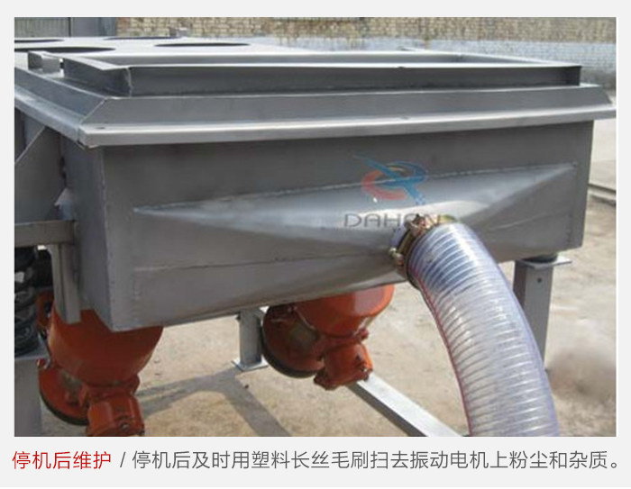 篩機(jī)停穩(wěn)后,及時(shí)用塑料長絲毛刷掃去振動(dòng)電機(jī)上粉塵;