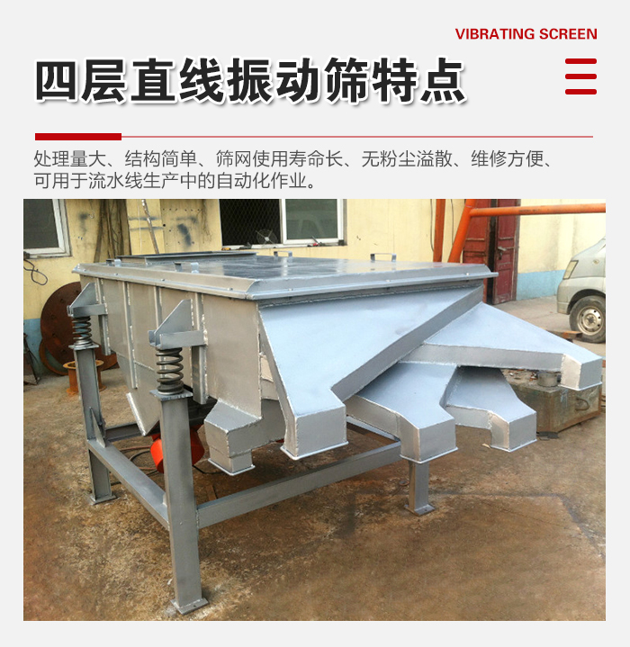 直線振動篩的結構包括:篩網,篩箱,防塵蓋,進料口,振動電機以及出料口等。