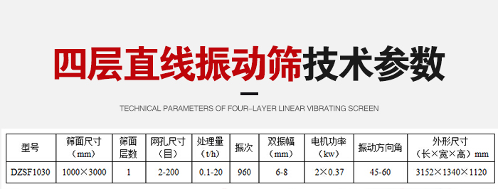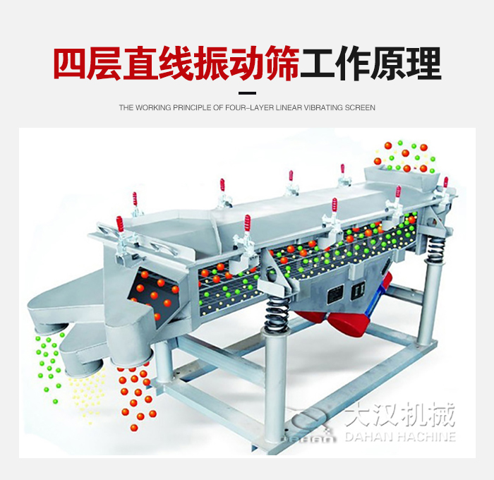 DZSF1030四層直線振動篩為雙振動電機驅動。當兩臺振動電機做同步、反向旋轉時,其偏心塊所產生的激振力在平行于電機軸線的方向相互抵消,在垂直于電機軸的方向疊為一合力,因此篩機的運動軌跡為一直線。兩電機軸相對篩面在垂直方向有一傾角,在激振力和物料自重力的合力作用下,物料在篩面上被拋起跳躍或向前作直線運動,從而達到對物料進行篩選和分級的目的。