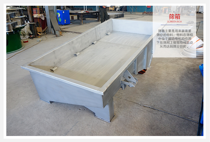 篩箱:篩箱主要是用來裝需要篩分的物料,物料在篩框中由于振動電機的作用下在篩網上做拋物線運動從而達到篩分目的。