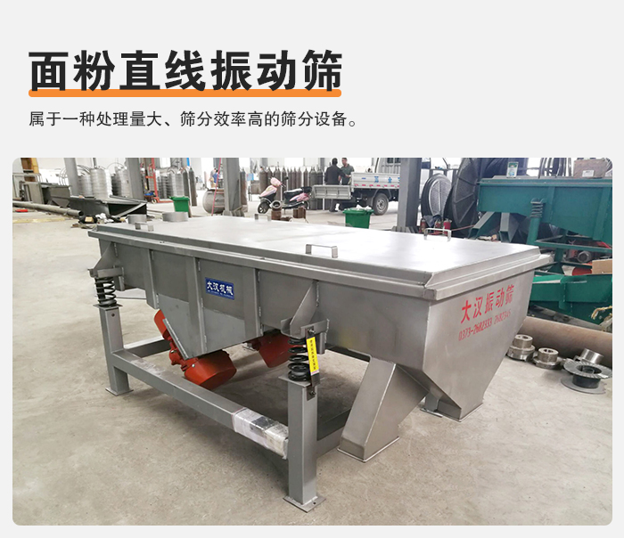 面粉直線振動篩由篩箱、篩框、篩網(wǎng)、振動電機、電機臺座、減振彈簧、支架等組成。