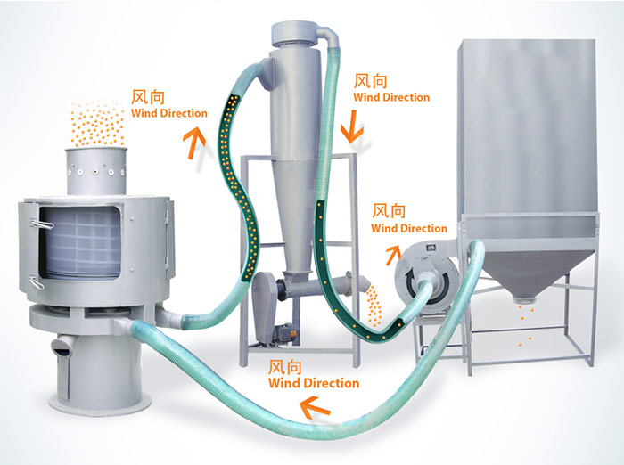 氣流篩摒棄了傳統重力勢能作業的原理,采用空氣作載體,動能作功的作業原理,通過負壓氣流將物料與空氣混合后,在密閉狀態下利用高速氣流做載體,使充分擴散的粉料微粒以足夠大的動能向篩網噴射,然后經過蝸殼收集超徑物料不能過網,由自動排渣口排出,從而達到對物料的快速篩分。